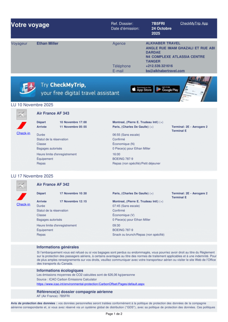 Remarque : une réservation de vol n’est pas un billet émis et ne contient pas de numéro e-ticket.